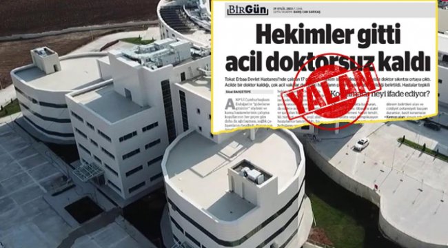 Birgün gazetesinin bugün 3’üncü sayfadan yayınladığı “Hekimler gitti acil doktorsuz kaldı” haberinin yalan olduğu belirlendi.Tokat’ın Erbaa ilçesindeki devlet hastanesinde görevli 17 pratisyen hekimin tamamının istifa ettiği ve acil serviste yalnızca 1 pratisyen hekimin kaldığı iddia edilen haberin dezenformasyon olduğu öğrenildi. 1 DEĞİL 35 HEKİM VAR