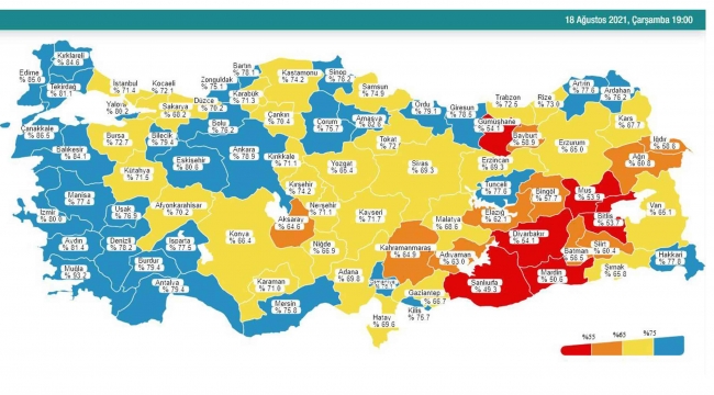 Bakanlığın tablosuna göre yüzde 52,4 ile Türkiye'de en az aşılamanın gerçekleştirildiği Şanlıurfa’yı sırasıyla Mardin, Gümüşhane, Bitlis, Diyarbakır, Muş, Batman, Bingöl, Bayburt ve Iğdır takip etti.
