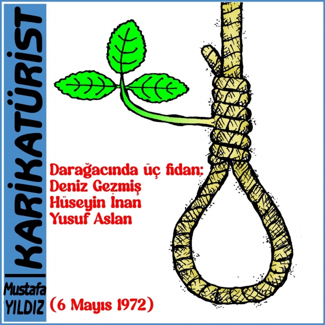 Türkiye’nin demokrasi mücadelesinde sembolleşen üç isim, Deniz Gezmiş, Hüseyin İnan ve Yusuf Aslan, idam edilişlerinin 53. yılında anılıyor. 6 Mayıs 1972 sabahı Ankara Merkez Cezaevi’nde darağacına gönderilen bu üç genç, Türkiye’de devrimci hareketin sembol isimleri haline geldi. Görsel sanatçı Mustafa Yıldız’ın çizimiyle sembolleşen “üç fidan”, halkın belleğinde bir umut ve direniş simgesi olarak yaşamaya devam ediyor. Karikatürde yer alan yeşeren filiz, darağacına rağmen yeşeren umudu simgeliyor. Onların inandığı eşitlik, özgürlük ve bağımsızlık idealleri hâlâ Türkiye gençliğinin hafızasında canlılığını koruyor. KARİKATÜR