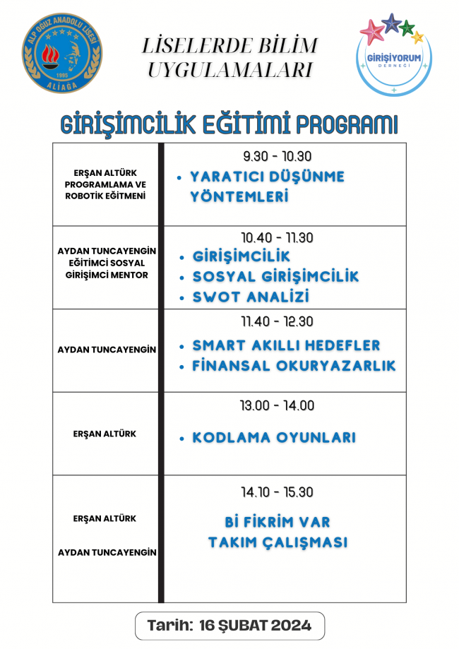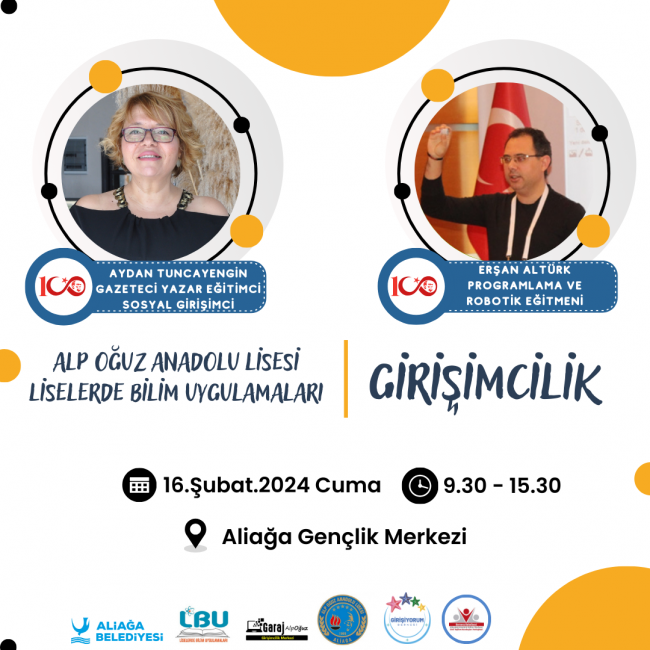 Milli Eğitim Bakanlığı Ortaöğretim Genel Müdürlüğünce 2023-2024 uygulamaya konulan "Liselerde Bilim Uygulamaları Programı" kapsamında Aliağa da Alp Oğuz Anadolu Lisesinde yürütülecek “Girişimcilik” başlıklı faaliyetler Garaj Alp Oğuz Girişimcilik Merkezi ve Girişiyorum Derneği işbirliğinde planlandı.